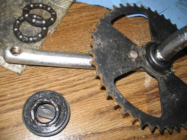 Retire el cojinete (cono) del mismo modo y sacar los rodamientos (que son en un retenedor) y estas a un lado (limpiar em si no quieres tener que limpiar y engrasar los cojinetes, o no Si honestamente no podía cuidar menos sobre la bicicleta.). Deslice la biela hacia fuera a través del agujero y en su banco.