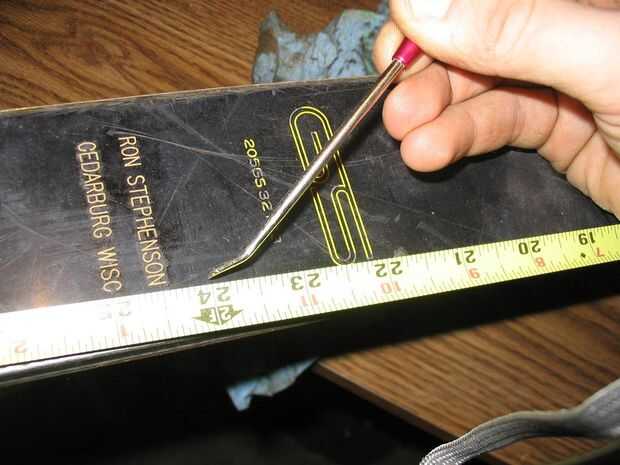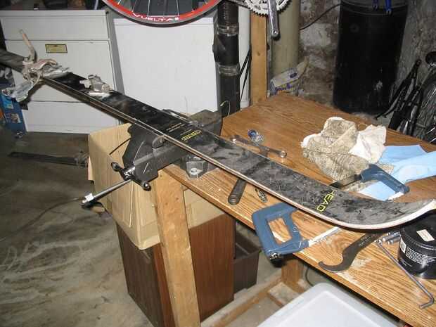 Abrazadera para el esquí en un tornillo de banco o sobre una mesa o algo para hacer el corte. Cortando de esta manera (versus sujeta lateralmente) hace mucho más fácil conseguir un buen corte recto.