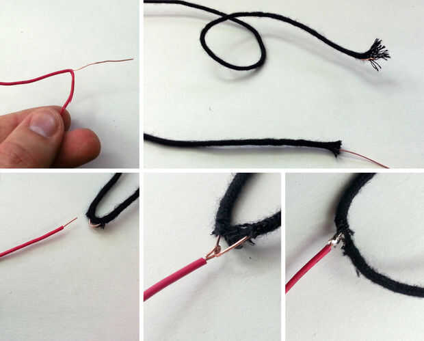 Hice este marco de alambre de cobre sólido alambre eléctrico insertado en los cordones con los acetatos quitado. El cable que tenía era demasiado grueso para alimentar dentro de los cordones de los zapatos que compré, la chaqueta de Vinilo fue despojada de una longitud de cable igual a la longitud de mi cordón y entonces alimenta en los cordones hasta que todo el camino a través.