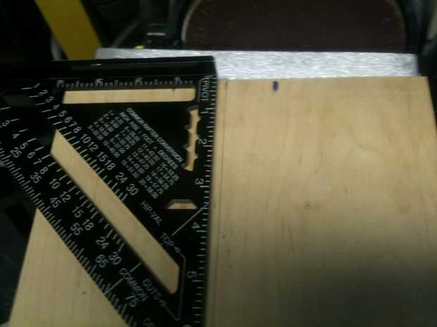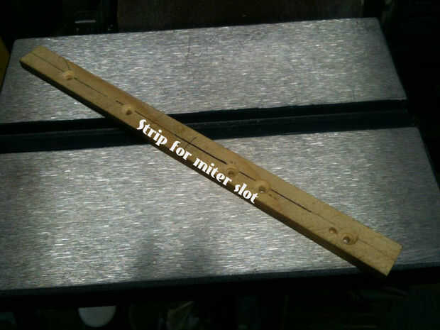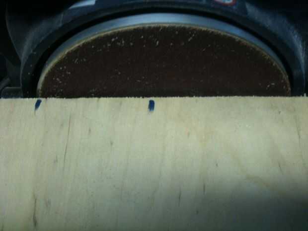 I cortar la base del mismo tamaño que la mesa de trabajo de sanders, corte una tira de madera para la ranura de inglete de la mesa de trabajo de sanders y atacó a la Plaza base de madera contrachapada para el disco. Con la base de madera contrachapada en la mesa de trabajo hice dos marcas en la base en relación con el centro y el lado izquierdo del disco de lija. Entonces dibujé una línea entre las dos marcas.