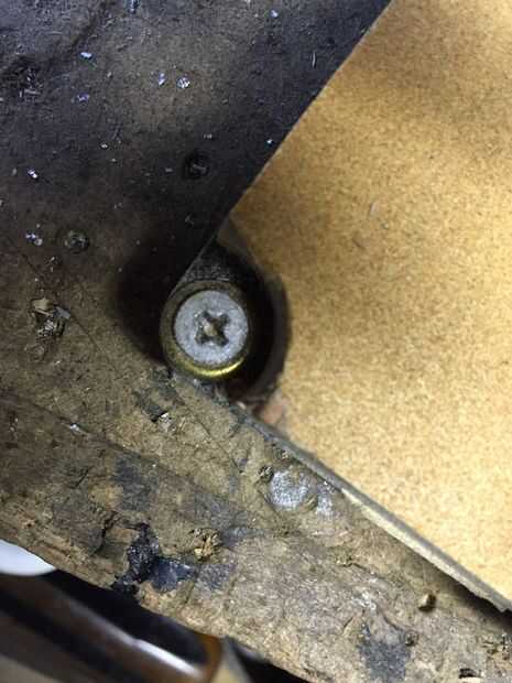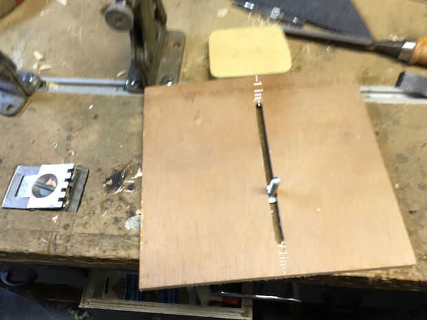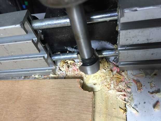 Muesca en la esquina superior izquierda con un ½" forstner bit, para acceder al tornillo de la máquina cuando la tapa está sujeta a la placa metálica.