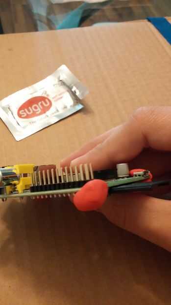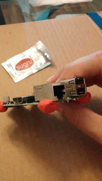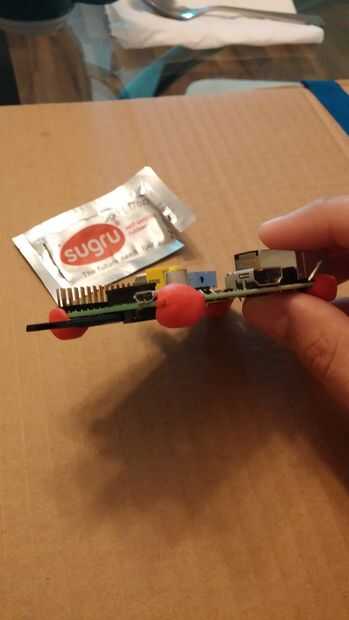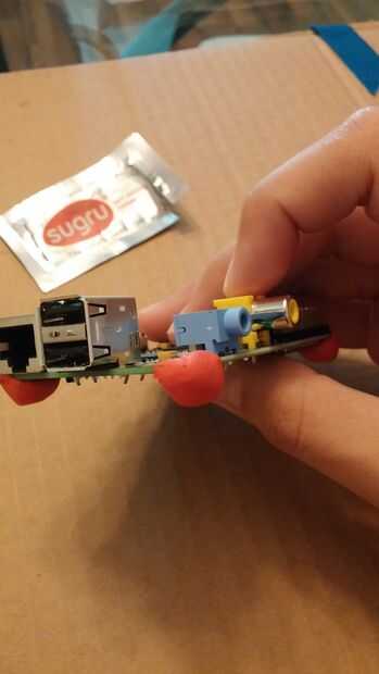 Coloque el Sugru en las 4 esquinas del tablero modelo B. Preste atención para evitar que el puerto Ethernet, el puerto de conector de alimentación, los pernos y la tarjeta SD. Asegúrese de que usted mira el agujero de montaje cerca de los puertos USB para permitir la ubicación de los tornillos.