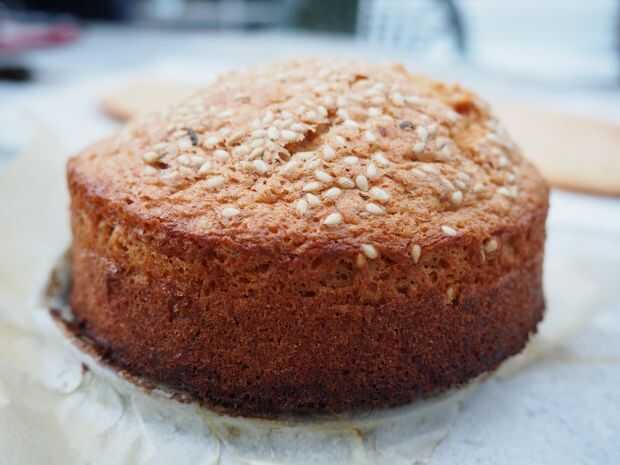 - Cuando todo está hecho, su forma de torta de mantequilla y llenar hasta 3/4 de la altura. Utilicé toda esta masa en una forma pequeña de 11cm de diámetro pero ser libre de experimentar con otros tamaños y cantidades. Espolvorear semillas de sésamo en la parte superior, realmente da un aspecto de pan para el pastel. No tenga miedo de poner bastantes porque ampliará su pastel mientras se cocina. Se pueden ver en la cuarta foto todos los experimentos que he intentado hacer el pan y en el frente obviamente no puse suficiente semillas.