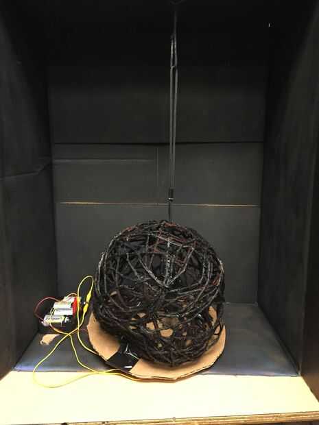 Configurar la caja con el extremo corto abajo, cola el motor hacia la parte inferior de la caja, Conecte cualquier lado de una cuerda a una linterna, creando un lazo, con la luz hacia arriba, la parte superior del bucle a la parte superior de la caja de la cinta y colgar la linterna hacia abajo en el Red Globo