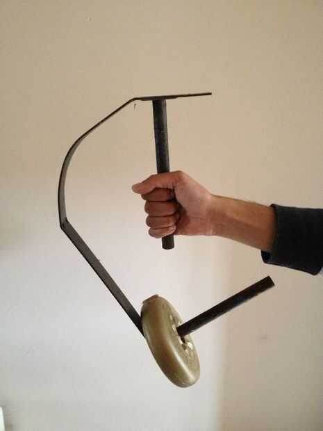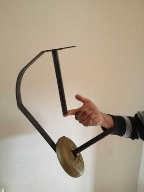 Desea obtener el soporte de metal de la estantería de Ikea y doblar. La forma que busca es que en la imagen. Hay algunos puntos de debilidad en el metal que se dobla debido a los agujeros. Asegúrese de que usted no doblar demasiado en que es probable que encaje aquí. Lo he conseguido doblar es mediante el uso de apalancamiento en mi pierna y un poco de fuerza bruta. Desea que el peso de estar por debajo de la 'manija' al cabo (o equilibrar en algo) no incline hacia delante, hacia atrás o de lado a lado. El peso que usa es un peso de 1,1 kg (2,5 libras) con barras de hormigón.