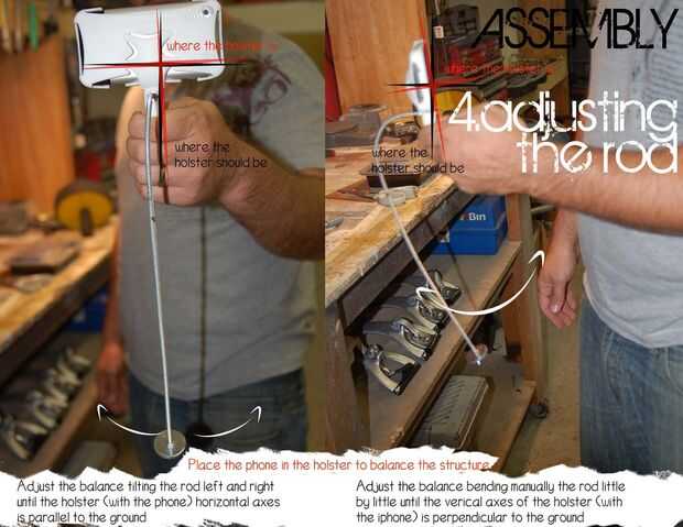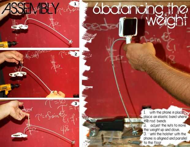 Coloque una banda elástica en una línea tangente a la parte inferior de la funda - como en la foto. fácil de colgar de un alambre o que alguien lo sostenga. ahora mover las pesas hacia arriba o hacia abajo de la barra hasta lograr un equilibrio - la cara del teléfono (que en este momento es hacia abajo) es más horizontal posible.