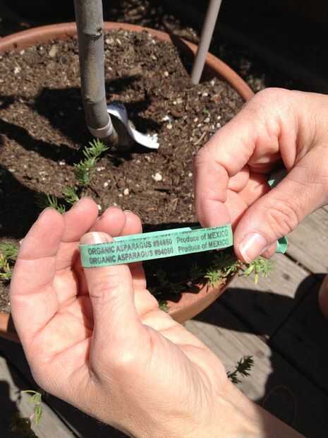 Utiliza las bandas de goma de brócoli y los espárragos, atados juntos en 2 cadenas cortas de igual longitud.