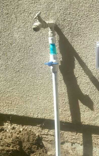 3. Cubra el extremo de la pipa del PVC y el interior del adaptador macho con pegamento azul rojo. Introduzca el tubo de PVC en el adaptador macho. (Azul)