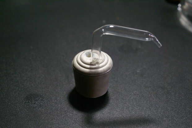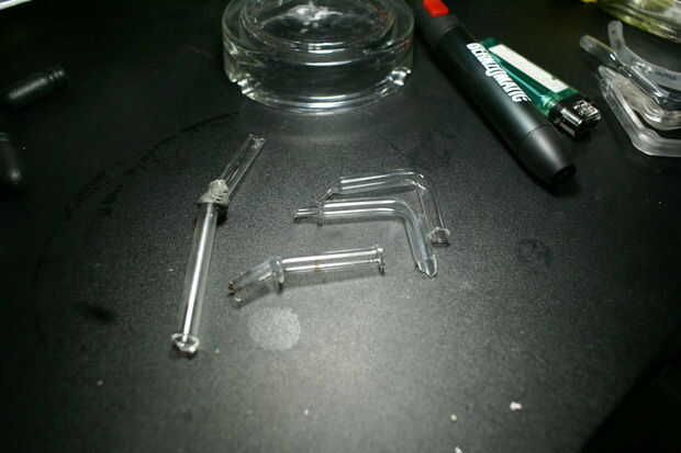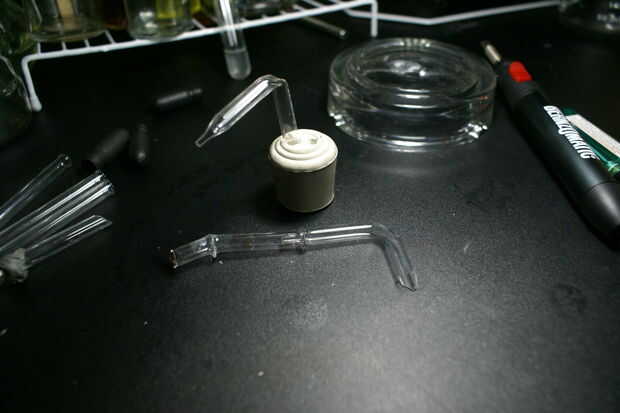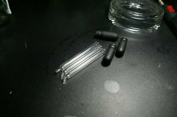 El proceso es bastante simple, pero difícil de ejecutar al principio. Calor uniformemente alrededor de una pulgada del tubo de cristal girando lentamente alrededor de una llama abierta. Tiempo de fusión de vidrio varía dependiendo de la fuente de calor. Una vez que es suave, doble rápidamente en un ángulo recto. Ponga a un lado para refrescarse.
