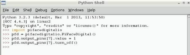 Crear un nuevo objeto Digital PiFace, lo llaman PFD. Nota: en Python el caso del código es importante, asegúrese de que copia esta carta por carta.