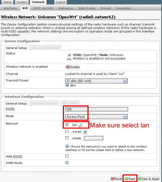• La red no está seleccionada de forma predeterminada, asegúrese de que se selecciona la lan como se muestra.