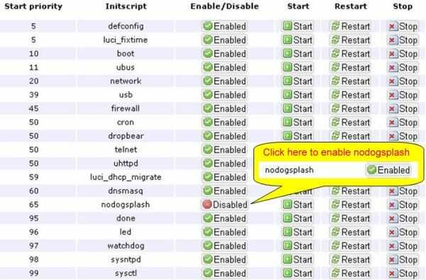 • Seleccione sistema -> Inicio, haga clic en el botón desactivar junto a nodogsplash como se muestra.