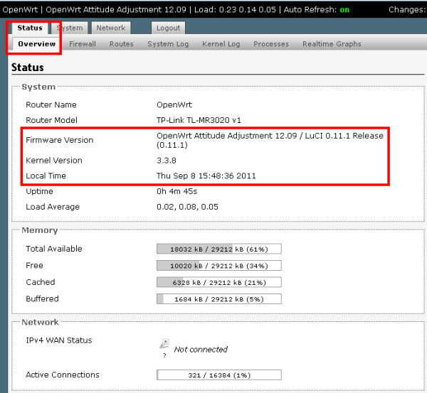 Como se muestra en la figura es el estado de OpenWRT para mi TP-Link TL-MR3020
