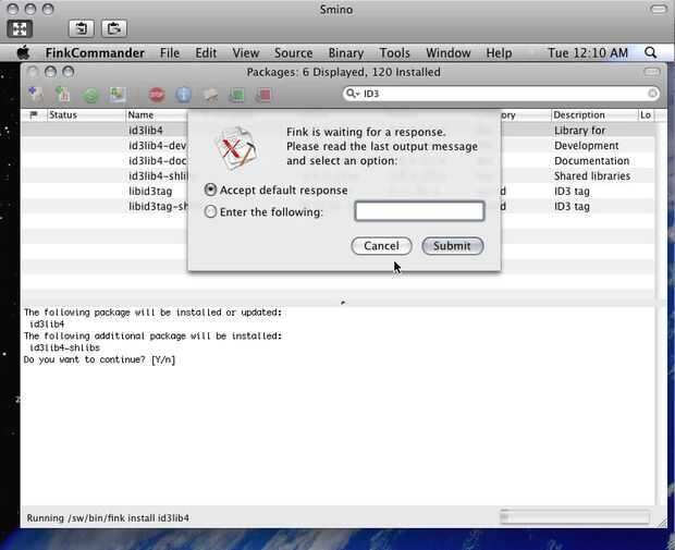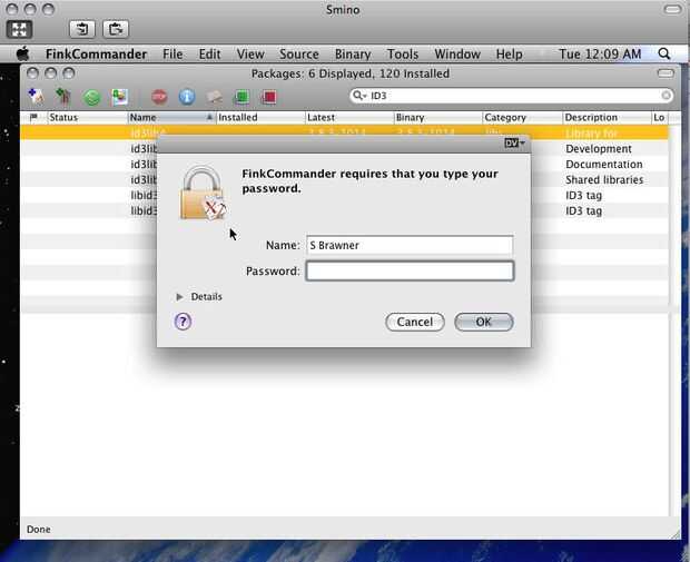 Después de instalar y después copiar FinkCommander, ejecute FinkCommander desde la carpeta aplicaciones. Hacer una búsqueda de «gdbm» e instalar el gdbm3 y el gdbm3-shlibs paquetes de fuente (es el botón con los .h y signo +).