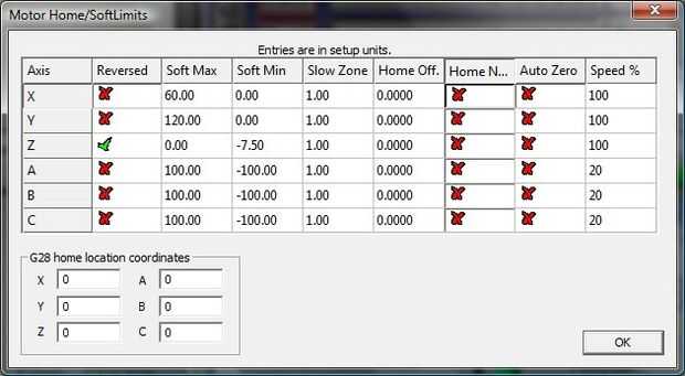 5) ir a Config/Homing límites. Entrar en las dimensiones del área de corte para su Router.