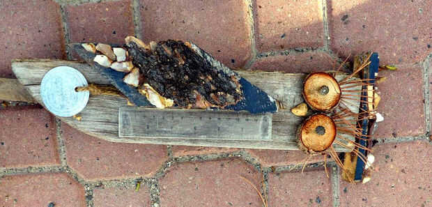 Simplemente presentado mis antecedentes (tablero de plataforma) y probar diferentes combinaciones de desechos. Las notas en la foto 1 le informará las diferentes piezas que decidí usar. Una vez tuve un diseño que me ha gustado, sujeté todo con la masilla.