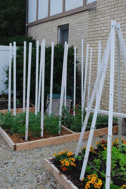 El año pasado, me dieron vinilo vallado. Al tiempo, que tenía grandes planes para valla... pero luego he cambiado mi mente. Tan en lugar de enviar la guía al relleno sanitario, yo metido lo en un rincón de mi patio hasta que encontré alguien que podría utilizarlo o he encontrado un nuevo propósito para él. Ese material de la valla se ha convertido en mi nueva estacas de tomate y jaulas.