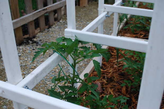 Usar el alambre para formar las plantas de tomate dentro y en los paneles laterales de las jaulas de tomate.