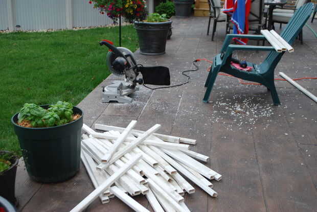 usé mi sierra de inglete compuesto para cortar el vinilo. Asegúrese de que usted utilice gafas de seguridad. Pequeños pedacitos de plástico volaban por todas partes.