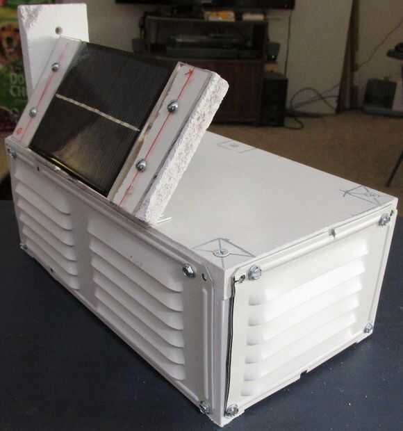 Originalmente, tenía placas del ducto de metal por los cuatro costados del recinto pero luego recuerdo que tenía que transmitir datos a la casa así que sustituye un respiradero con una pieza de plástico y que se le atribuye el PCB. Vea la foto.