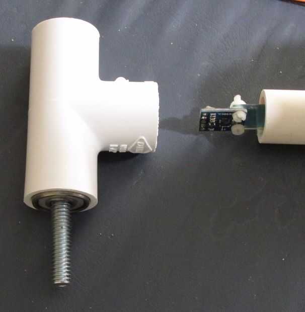 A continuación el perno es caído de la T y realiza con dos tornillos (no mostrados). Entonces el PVC con el magnetómetro se inserta en el lado del T.