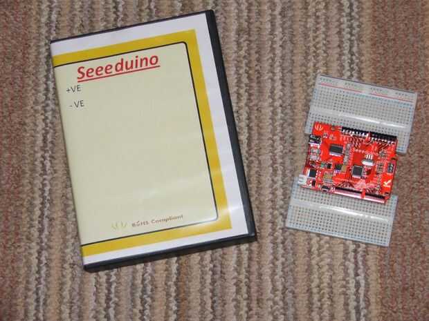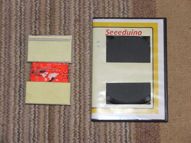 Pintura había diseñado e impreso una manga simple insertar debajo de la carcasa de plástico, para ocultar las molduras que el DVD y añadir un toque de profesionalidad para el proyecto. Tomé 2 cuadras breadboard y un bloque de tren de potencia, mi Seeeduino ha añadido pins para replicar las conexiones externas y permitir su uso con un protoboard.