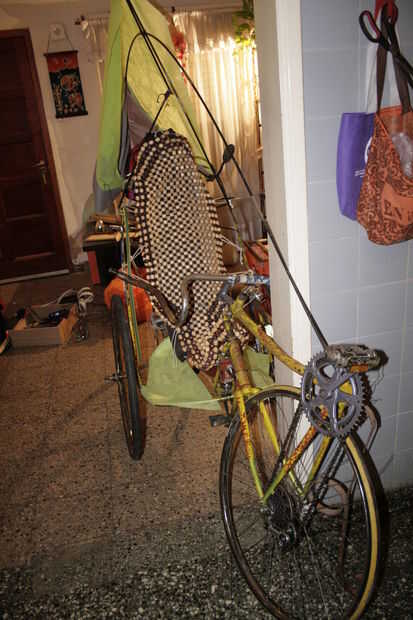 La idea principal es tener una manera de viajar alrededor del mundo utilizando una bicicleta reclinada, carring unas pocas cosas: una bici licuadora, didgjeridoo, pequeña guitarra, teclado musical (dentro de un palo de bambú), cámara de vídeo, cámara de fotos, pc de la tableta, gafas de video, un proyector de video (la cual no tengo todavía), así muy lindo participar por que precio, por favor voten por si te gusta el proyecto ,