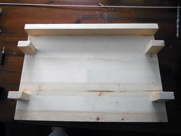 Atornillar el tablero y las patas. Poner pegamento para asegurar un ajuste apretado y seguir con los brazos a enroscar.