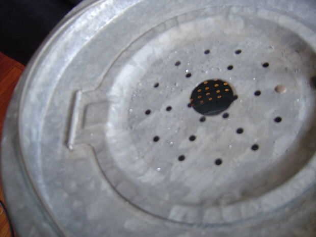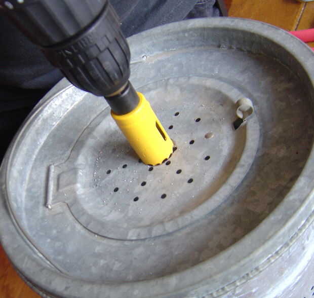Taladrar un agujero en el centro de la tapa articulada de su cubo. Encontramos que ayudó a tener un par extra de manos manteniendo el mandril al ras contra la superficie de la tapa. Coloque una arandela de goma 3/4".