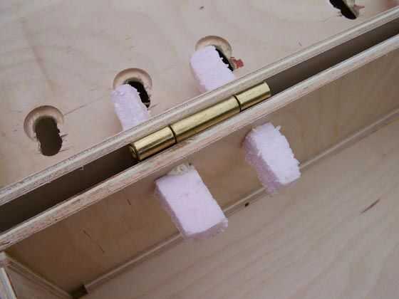 También, puesto que ya tienes como 14 tornillos que se pega en la caja, sería una buena idea para cubrir aquellos. Usé algunos restos de la espuma aislante rosada cuando remodelación hace algunos años. Sólo cortado a la medida y pegamento (pegamento para madera o pegamento funciona bien).