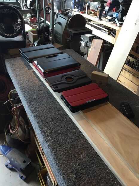 Ya que nuestro inventario de tablet es bastante robusto, que tenía que construir esta carga rack para satisfacer la amplia gama de tamaños que tenemos. La forma más sencilla que se me ocurrió fue hacer cada estante o rack capaz de sujetar dos cada uno. Originalmente, conceptualiza la rejilla va todo el camino por la pared. Una ranura para cada tableta y claramente marcados con su nombre. Cuando comencé a disposición todas las tabletas, parecía demasiado grande para un raspado que y vino para arriba con esto.