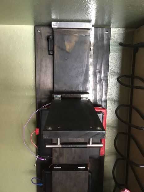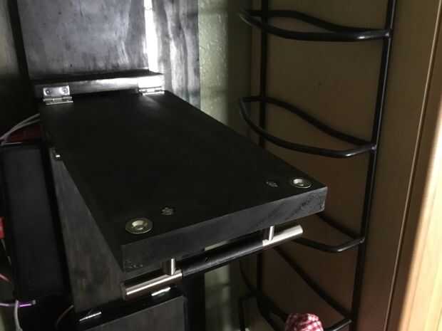 Las puertas de las ranuras son tablas de pino 1 x 4. Usé imanes avellanados para mantener la puerta cerrada. Los imanes hacen contacto con un pequeño trozo de plano robar stock. Es ligeramente más grande que la madera se une a la placa metálica. Esto es porque quería tener una pestaña para coger la tableta y evitar que se caiga cuando se abre la puerta.