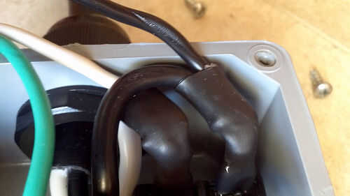2. prepare el enchufe J1772 quitando aproximadamente 6 pulgadas de aislamiento exterior exponiendo 4 o 5 cables. Si el cable 5 de proximidad sólo doble sobre y abrigo del encogimiento sobre él para que no corta en cualquier lugar no es necesario para la estación de carga. tira hacia atrás alrededor de 1/2 pulgada de los 4 hilos caliente (negro), neutro/Hot2 (blanco o rojo), tierra (verde) y piloto (naranja en mi cable pero algunos son de color azul). Soldadura o prensar los conectores correctos para su retransmisión en el caliente y el hilo neutro.