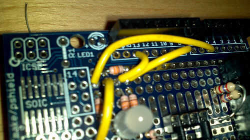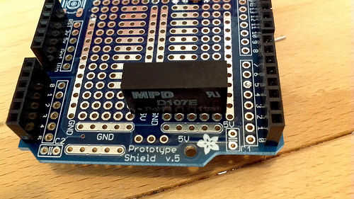 Conecté el MPD D107E el 5V y el GND pin alinearon con 5V central y carriles de tierra en el tablero de proto.