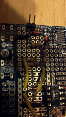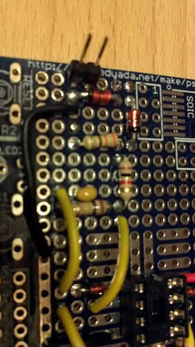 9. soldadura R15 (20k) a Gnd y R14 (100k) 5V, conectan resistencias entonces al Opamp pin 6.