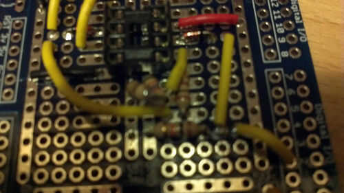 10. Conecte el diodo pin 7 de salida del Opamp al resistor de 10K y la a Arduino Digital 2 (D2), conecte el otro extremo de la resistencia a tierra.