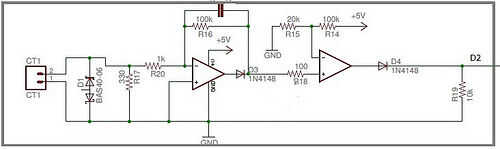 Este circuito funciona mediante el uso de un suelo falla actual transformador (CT) de CRMagnetics (CR8420-1000-G). La CT crea un pequeño voltaje cuando hay una falla. El pequeño voltaje del TC es amplificado en la primera etapa primero en comparación con un voltaje de referance de la segunda. Si el voltaje amplificado de CT es superior a la referance el Opamp pasa alto y provoca el Arduino registrar un inurupt en Arduino pin D2.