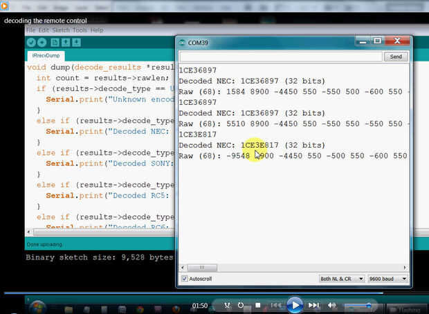 Registre el número corto generado cuando usted oprimió el botón del control remoto. En mi caso, el volumen botón fue 1CE3E817 y el número de bits (por ejemplo, 32 bits) que veo en mi programa de Arduino. Necesita reemplazar mi remota de código con el código de captura control remoto para el botón de bajar volumen.