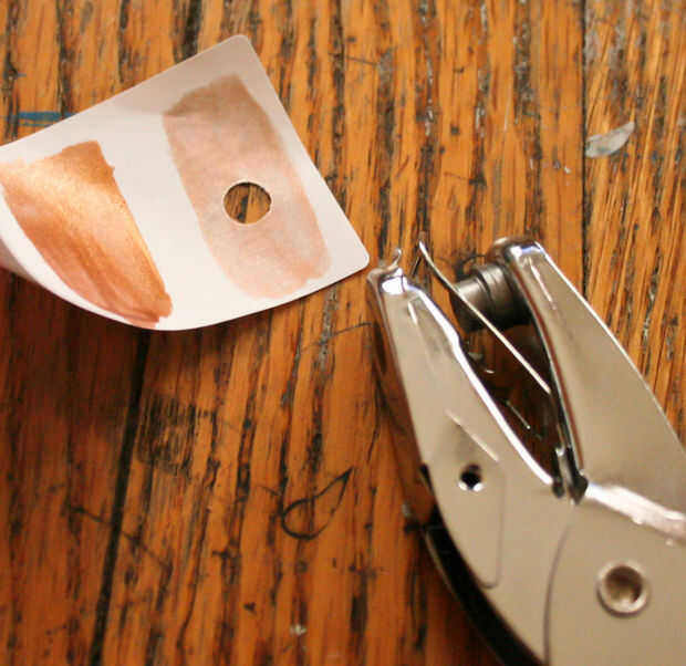 Una vez seco el esmalte, puede tomar un puncher de agujero y hacer un agujero en cada color. Me resulta fácil pelar apagado la etiqueta engomada y perforar el agujero. Bono: tratar de conseguir una perforadora de Fiskers que tiene una parte en el frente que se abre, así que, puedes poner solo la derecha dedo en y el adhesivo pegará derecha en el cojín de su dedo para que usted puede sacar.