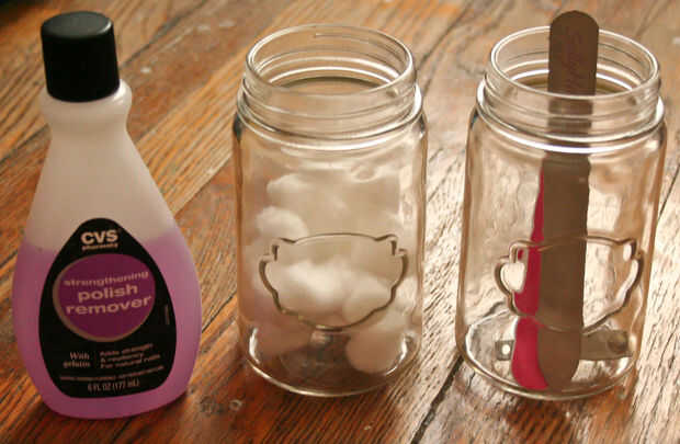 Ahora, usted va a tomar dos frascos de vidrio y cosas con las herramientas de cuidado de uñas! Puede utilizar uno de bolas de algodón o almohadillas y otro para sus empujadores de cutícula, uñas cortadores, limas de uñas, cualquiera que sea! Sólo tiene que añadir una botella de removedor de esmalte de uñas también!
