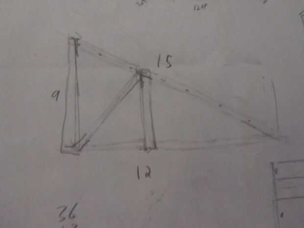 Los lados están dos 30 60 90 grandes triángulos que funcionó perfectamente para mi no aun sabiendo ya que era 9 pies de mi canal en el suelo y mirar nuevamente fotos de mi vieja rampa quería la hipotenusa a 15 pies. Luego de allí estima que el fondo sería alrededor de 12 pies así que lo hice un poco de matemáticas para ver cuánto el fondo sería y resultó ser un triángulo perfecto con cada longitud es 9 x 15 x 12.