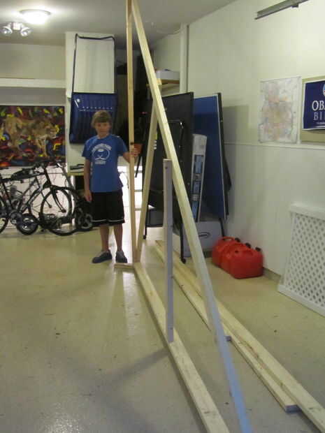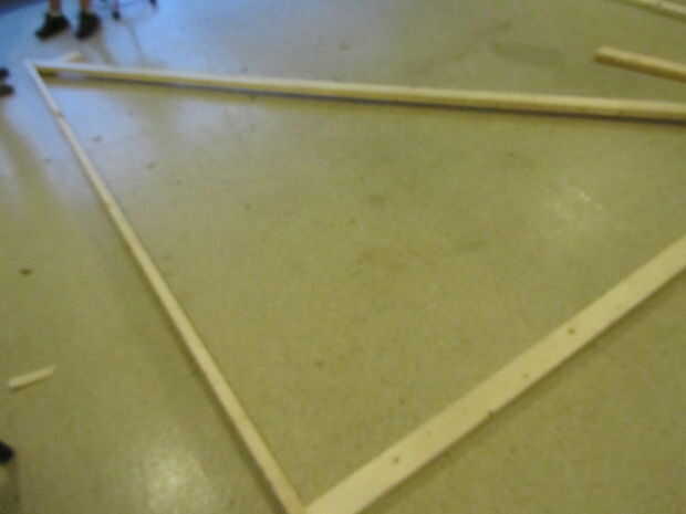 Después que utilizar la pieza extra de 7 pies y puso desde la derecha ángulo el donde siempre la parte superior de la misma toca la hipotenusa. Las piezas de 4 pies y 7 pies deben ser unos 3 pies de distanciados.