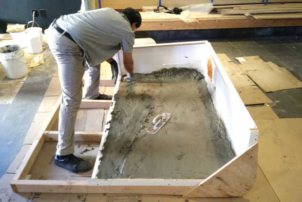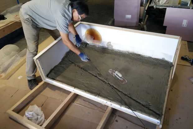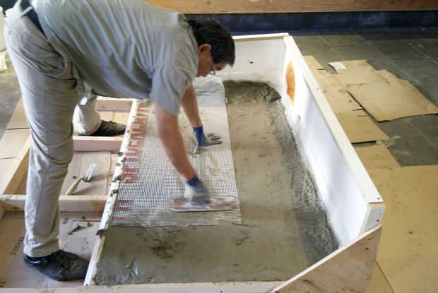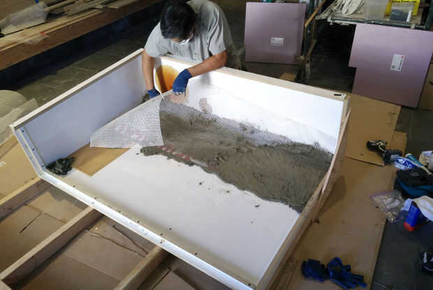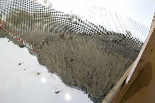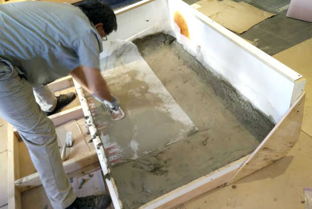 Malla de fibra de vidrio más es con llana en la parte posterior y entonces es el momento de inclinar el formulario y comenzar las otras paredes del embalaje.