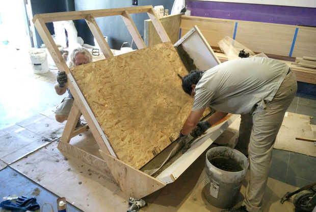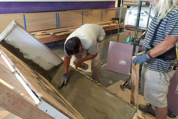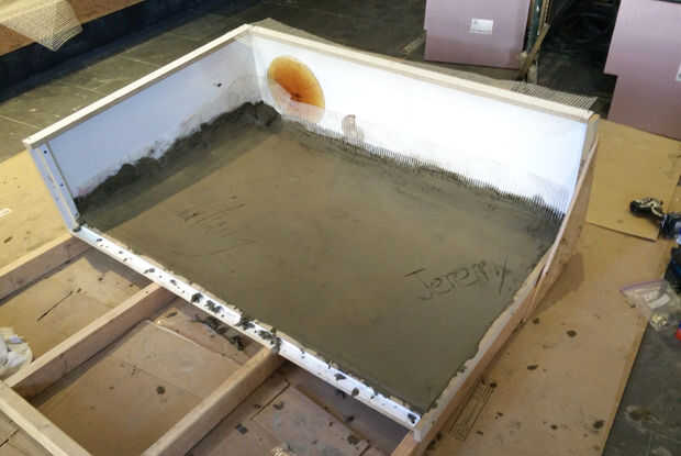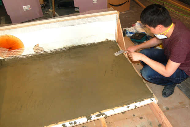 Para evitar que la mezcla resbale hacia abajo cuando la forma es inclinada, un 3/4" pieza de madera contrachapada se coloca en la parte posterior. Entonces se llena la parte superior del formulario, y finalmente el resto de la pared.
