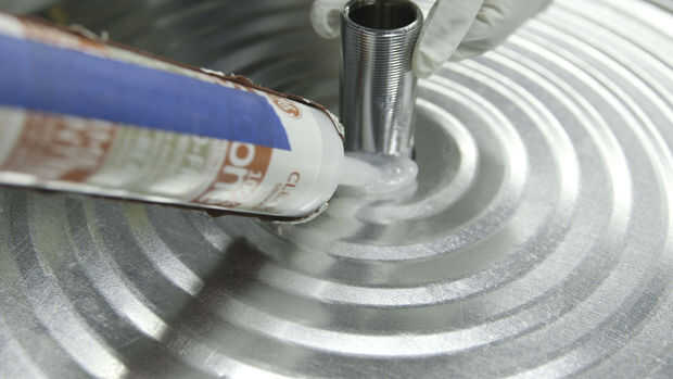 El siguiente paso fue poner la tina de lavado. En primer lugar, usé una sierra para perforar un agujero en el centro del mismo tamaño que mi drenaje de filtro. A continuación, usé un montón de sellador de silicona alrededor del agujero en el centro de la plataforma para una capa adicional de protección contra el agua.
