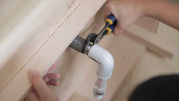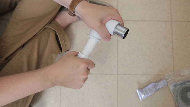 Con mi adaptador de manguera de Frankenstein montado, puse alguna cinta de Teflón alrededor de la rosca del niple de drenaje y atornilladas firmemente en el extremo del desagüe coladera con algunas cerraduras del canal.