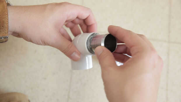 En primer lugar, apliqué una buena dosis de E-6000 la boquilla de metal que viene con el filtro de drenaje. E-6000 es resistente al agua y se adhiere a casi cualquier cosa, así que me pareció una buena opción para esta aplicación.