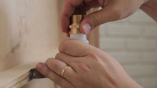 Cuando esto estaba en lugar, solía alguna cinta de plomería mantenga el adaptador firmemente sujetado en la parte inferior de la plataforma. Esto es muy importante porque cualquier tensión puesta en él por la manguera de jardín podría romper los sellos de E-6000 que yo estoy confiando en mantener mi piso seco!