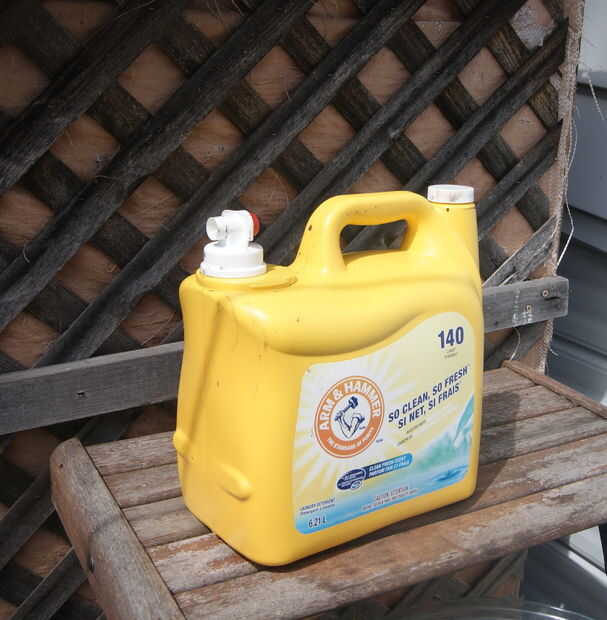 Generalmente estos contenedores no son enjuagar al ser sacudido, lo. Usar sólo una taza de agua es el primer enjuague que puedo reciclar el diluir detergente para lavandería de mano. Suavemente agite el agua para no construir una gran cantidad de espuma. Agregar vinagre al último enjuague se reduce en algunos espuma así como ayuda a deshacerse del olor a detergente.