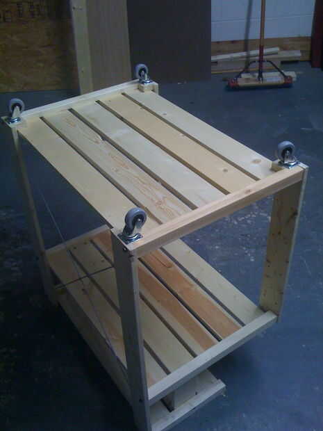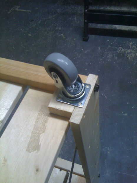 Con la unidad boca abajo, colocar las ruedas y marcar los puntos para perforar agujeros. Con el arroyuelo ruedas tres de los agujeros alinean en la madera pero el cuarto no. Podría ser lo suficientemente estable como para sujetar cada rueda con tres tornillos, pero mina había estabilizado mediante la adición de un pequeño pedazo de trozo de madera en cada esquina. Después de taladrar los orificios piloto, atornille las ruedas. Dan la vuelta hacia atrás y listo. Ahora intenta cargar para arriba.